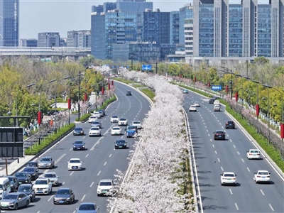 作为“最美景观大道”,文一西路道路中央绿化带全线种植了染井吉野高杆樱花730余株、红绯衣高杆樱花1900余株,非机动车隔离带种植了樱花1000余株,盛花期集中在3月下旬至4月初。