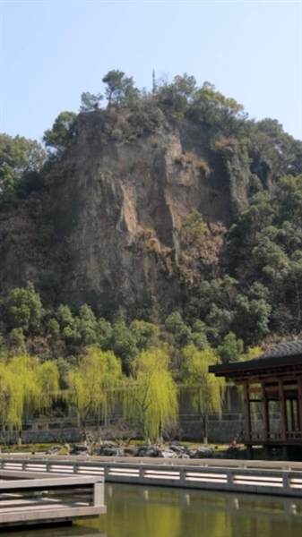站在主书房前的长桥上,看向西侧,山顶草木茂盛,岩壁肌理神似李唐的大斧劈皴画法,俨然《万壑松风图》再现。