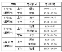 考试持续4天,分别是6月7日考语文、数学;6月8日考技术、外语;6月9日考物理、思想政治、化学;6月10日考历史、生物、地理。