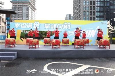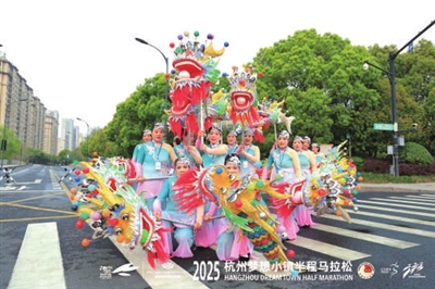 在赛事起点,由风筝制作技艺市级非遗传承人程迪申带来的中华巨龙风筝放飞,寓意跑者们放飞梦想、活力启航。还有径山镇的《盛世花鼓》震撼登场、仁和街道的《高头竹马》演绎南宋传奇、余杭街道的《五谷龙》则舞出农耕文化的深厚底蕴,祈愿风调雨顺……