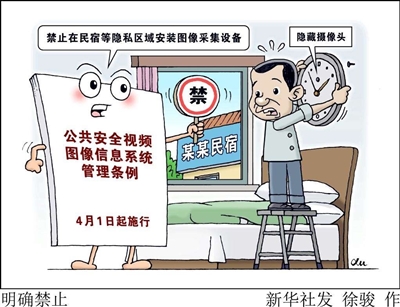 《公共安全视频图像信息系统管理条例》4月1日起施行。《条例》明确,禁止在民宿、宿舍、更衣室等能够拍摄、窥视、窃听他人隐私的区域、部位安装图像采集设备设施。对违法安装图像采集设备设施,或者非法对外提供、公开传播视频图像信息的,没收设备设施、删除视频图像信息、给予罚款处罚;偷窥、偷拍、窃听他人隐私的,依法给予治安管理处罚。