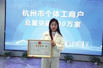 本报讯 (记者 郑锋龙 傅博文) 昨日,余杭区政务服务中心迎来历史性一刻:杭州第100万户个体工商户营业执照颁发。接过执照的叶泽霞难掩激动地说:“从选址到开业,全靠数字化工具‘神助攻’,原本最头疼的难题变得像点外卖一样简单。”