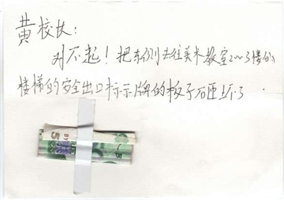 “‘心朋友信箱’是面向学生开设的校长信箱。”黄校长告诉记者,上周日,他在整理信箱时发现了一封手写的匿名道歉信,这位同学说自己不小心打碎了安全出口标识的玻璃,上面还用双面胶绑了50元现金。