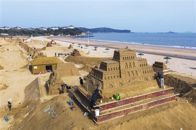 4月8日,沙雕艺术家在创作舟山国际沙雕节沙雕作品(无人机照片)。