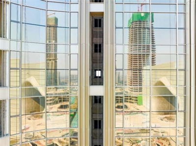 约213米的C、D塔楼已于去年下半年封顶,目前框架式幕墙立面施工完成90%,暖色系玻璃与铝板搭配,形成如金色云瀑般的外立面,在阳光的映衬下熠熠生辉。