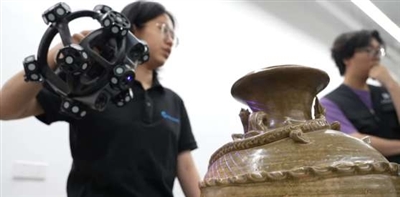 在中国美术学院,思看科技(杭州)股份有限公司的工程师正用自主研发的球形3D扫描仪,对晚唐至五代的青瓷盘龙罂等文物进行精细化数据采集。在“文物保护”模式下,通过一类激光安全认证的激光线束可实现零接触、零损伤的数字化扫描,将千年文物的釉色渐变、胎体肌理转化为数字资产。
