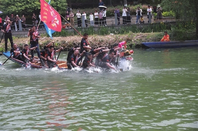 仓前龙舟不以速度为胜,比的是溅起水花越高越好。浪起时,龙舟犹如水中蛟龙吐水,煞是好看。水中龙舟乘风逐浪,两岸观众高声喝彩,鼓声、划水声、加油声声声入耳,将现场气氛不断推向高潮。