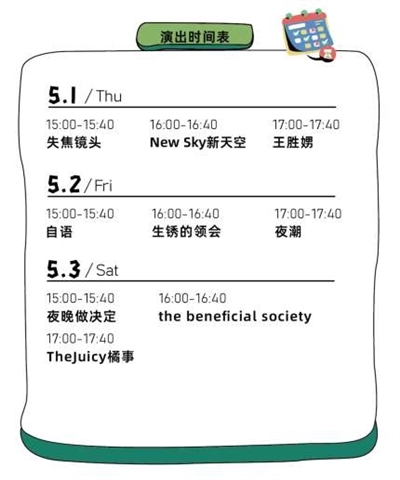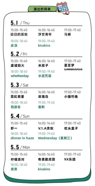 当暮色笼罩青山,舞台灯光亮起。皮浪、水泥咒语、Wednesday等乐队用摇滚、电子、独立音乐点燃夜晚。不如带上野餐垫,躺进草地,仰望星空,感受音乐与自然的双重浪漫。这里的夜晚属于每一个热爱自由的灵魂。