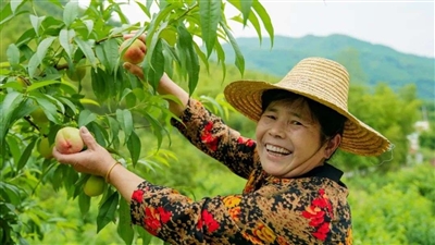 清晨6时,果农已沐浴着霞光开始劳作,他们穿梭在桃林中,慧眼识珠地挑选成熟的桃子,小心翼翼地采摘下来,再送到不远处的工作室装箱打包。8时许,已有顾客前来取货,品尝田间地头的新鲜。