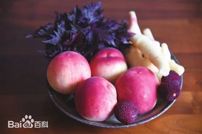 材料:桃子、紫苏叶、子姜、醋或柠檬汁、白砂糖