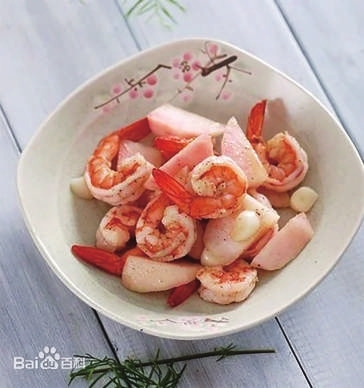 材料:大虾、桃子、大蒜、黑胡椒、盐