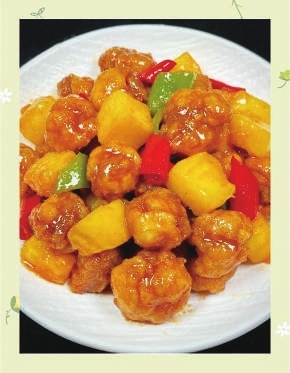 材料:梅头肉、桃、盐、胡椒粉、白酒、蚝油、蛋黄、生粉、酸甜汁