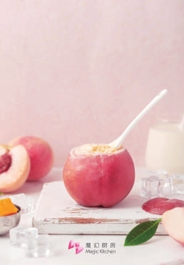 4.果肉倒入混合液拌匀,再倒入水蜜桃,冷冻5小时即可。