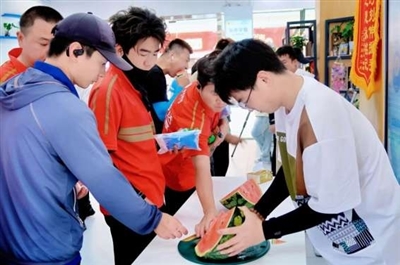 “西瓜派对”点燃现场气氛。小哥们在欢声笑语中分享夏日的甘甜。活动尾声,每位参与者都收到了一份“清凉心意”:冰镇饮料和装满藿香正气水、清凉油等防暑物品的清凉包。