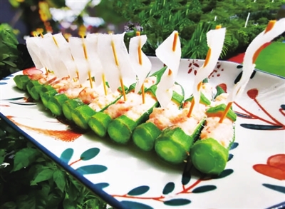 这道“一帆风顺”将秋葵做成帆船形,塞入炒香的馅料,上锅蒸制而成,营养丰富且造型别致,寓意生活一帆风顺。