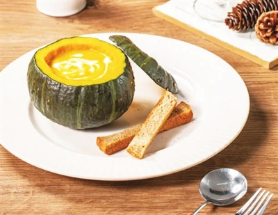 想给平常的早餐增添一份仪式感?记者推荐这道奶油南瓜浓汤,甜糯中透着香气,浓郁鸡汤与奶油交融,入口丝滑、回味悠长。