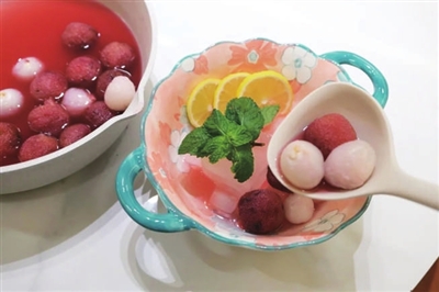 5.将煮好的杨梅荔枝糖水倒入容器,室温放凉后冷藏2小时;