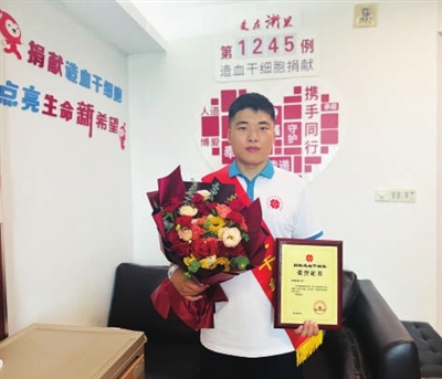 在医务人员的悉心照料中,省、市、区级红十字会工作人员和家人的陪同下,经过近三小时的采集,沈志豪成功捐献了153毫升造血干细胞混悬液,它将承载着生命希望,第一时间送往患者所在医院。他也成为了余杭区第48例、浙江省第1245例、杭州市第390例造血干细胞捐献者。
