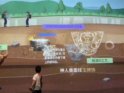 以“地层大冒险”体验空间为例,观众用小毛刷轻刷墙面上的地层,会随机发现文物,每次各不相同,文物发掘后会演绎动画,如雕刻有神人兽面纹的玉牌饰,动画会着重凸显其上纹饰、玉鸟会化身飞翔的小鸟。出土于钱山漾遗址的丝线是目前已知最早的丝绸遗存,动画中会出现蚕宝宝,还会弹出文物背后延伸的信息。观众既可以感受考古发掘的乐趣,也能进一步了解文物背后的故事。