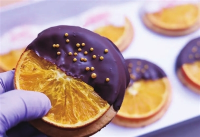 材料:橙子2个、白砂糖30克、水55克、黄油78克、糖粉40克、橙汁25克、低筋粉145克、海盐1克、橙皮屑6克、白巧40克、黑巧40克