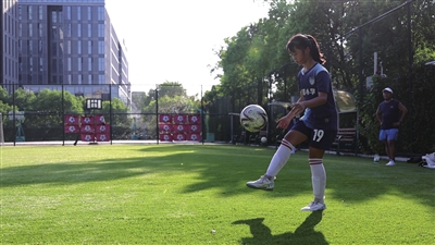 周妙宸是左前锋的位置,传球、盘带、变向、拨球,都很灵活。她一副熟练又淡定的样子,仿佛达到“人球合一”的境界。即使是傍晚太阳快下山的时候,室外仍然是38℃的高温。休息的间隙,周妙宸已满头大汗,她却笑嘻嘻地告诉记者,自己喜欢足球,喜欢那种在太阳底下奔跑的感觉。带着足球在脚下,足球仿佛生根一样挂在了自己的脚下,再摆动带出,最后射门进球,这种自豪感很难用语言来形容。