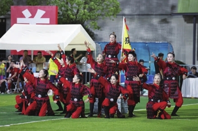比赛中场休息时间给各镇街的群众文艺团队提供了展示在地文化的舞台。比如,黄湖文艺团队带来的《龙腾未来》表演,源于黄湖庙会、青山村端午游龙会等品牌节目,融入了西湖绸伞、刺绣等本土非遗元素,尽显东方古典雅韵的磅礴之美。