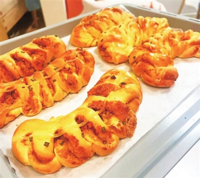 4.将卷好的小条依次向左侧卷起,二次发酵到体积变大,并刷上全蛋液;