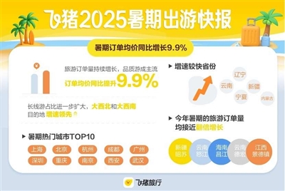 本报讯 (通讯员 刘博 记者 濮玉慧) 8月26日,飞猪发布《2025年暑期出游快报》。数据显示,今年暑期旅游需求强劲,机票、酒店、租车、海外当地玩乐等旅游订单量持续增长;品质游增长趋势明显,订单均价同比增长9.9%。学生和家庭客群的增加,让包含文化娱乐体验的旅行热度大幅增长。
