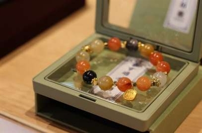 另一件新品“渚事亨通手串”则由“朱府铜艺”打造,以良渚核心礼器玉琮为原型,整体以铜铸琮体搭配五彩金丝玉、黑曜石,将沟通天地的礼器转化为腕间守护。