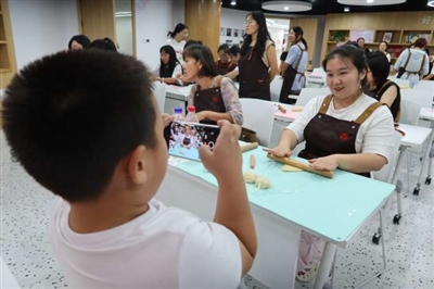 “妈妈看镜头!”学员李丹带着孩子来上课,她停下擀面皮的动作,让孩子拍了一张照片。作为老学员,李丹还在夜校学过非洲鼓、尤克里里和瑜伽。