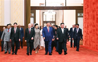 在喜庆欢乐的乐曲声中,习近平同中外嘉宾一起举杯,共同庆祝中国人民抗日战争和世界反法西斯战争的伟大胜利,共同祝愿世界和平。