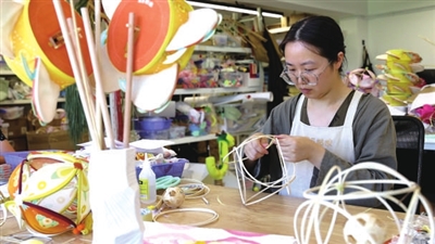 在众多竹原料的包围中,徐无瑕手持篾刀、刨子,将竹子劈成一厘米宽的光滑竹条,赶制中秋绣球滚灯新作“好运蝶蝶”。竹条编织成球状骨架,装上篾球和灯串,粘上粉紫色布料,缀以流苏和绣球,举起时宛如蝴蝶振翅,同时还融入古代乐器“磬”(谐音“庆”)的造型,增添了吉祥之意。