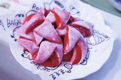 做法:西瓜切小块,打成汁;糯米粉、玉米淀粉、食用油中倒入西瓜汁,搅拌均匀后,倒入不粘锅,小火翻拌至熟透;稍微冷却后戴上手套揉拉几次;撒熟糕粉防粘,搓成条状,用刮板切成小三角形即成。