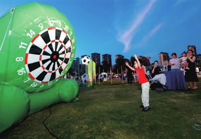 在每一个赛事开启的夜晚,足球热情也在全域范围内被点燃。比如,在闲林老街大草坪,大屏幕实时播出着赛事,附近居民观赛的同时,还能到老街闲来吾市区域体验亲子足球游戏、非遗手作等,配套商铺推出的消费满减活动,观赛、消费、体验的复合型场景在此展现。