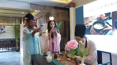 点茶环节,自媒体达人更是兴奋不已,架好自拍杆,在老师的指导下体验温盏、击拂、茶百戏等,每一步都充满艺术感和仪式感。最后轻捧茶盏,慢品茶沫在舌尖化开的醇厚滋味,从一盏茶中,外国友人们感受到千年茶文化与个人心境交织碰撞而出的独特魅力。