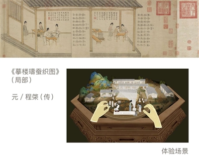 踏入古画《乞巧图》《摹楼璹蚕织图》中流连忘返,跟着织女学养蚕缫丝,抓起一只白胖的蚕宝宝,比一比谁采的桑叶多……这些是记者戴上MR眼镜后体验到的场景。