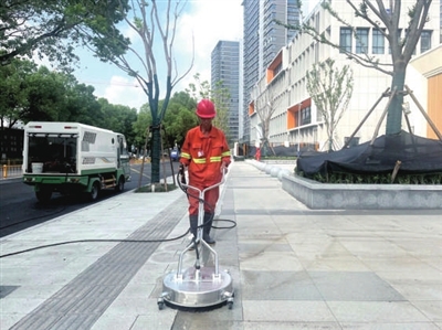 另一位高压冲洗车司机杨显国,则将清洁重点放在人行斑马线、道路护栏及公交站座椅、垃圾桶等“城市家具”上。他通过精准控制水流,清除缝隙中的污渍,让街道设施焕然一新,用干净整洁的环境迎接节日中的市民与游客。