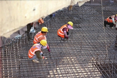 施工现场,每一位工人都全神贯注:有的搭乘升降设备升至高处进行巡检,有的俯身于错综复杂的钢筋丛林间进行绑扎加固。一根根坚硬的钢筋在他们手中,被精准地定位、牢固地连接,最终化作支撑这一重大项目的坚实保障。