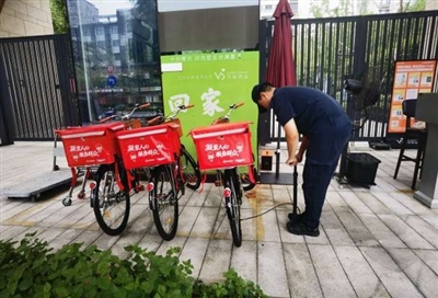 如今,骑手到达小区后,在物业人员的指引下,可先将电动车停放在指定位置,然后拿上外卖,换骑专用单车进入小区。通过这种“接驳”方式,外卖配送时间能节约五六分钟。