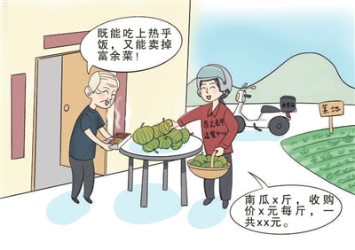 为了让老年人更便捷地吃上一餐热乎饭,百丈镇通过政府补贴、老人购买、市场运营的方式运营养老食堂。送餐员在上门送热乎饭时,了解到部分老人会将富余蔬果拿去农贸市场售卖,不仅路途远,卖不完还得带回来。