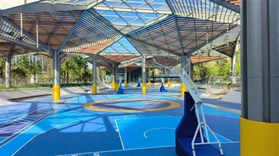 2片标准篮球场地结合地下室顶板,上部打造特色篮球场,设置为下沉式篮球空间,上部风雨连廊根据树林形态和规律的启发,通过建筑模块不同组合方式,创造出如同林下空间一样可以无限蔓延的建筑空间。