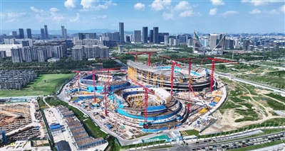 “这座总建筑面积约53.4万平方米的综合性体育场馆,是全国规模最大的全地下室体育建筑群。”项目负责人介绍。目前,专业足球场钢结构屋盖完成50%,综合体育馆、游泳馆两馆标段主体结构完成90%,整体预计2027年竣工,建成投用后可承办顶级赛事和大型演出活动。