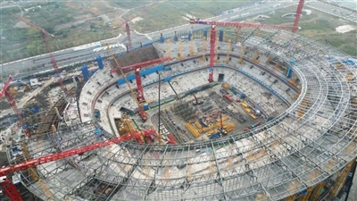 据项目团队介绍,随着混凝土主体结构封顶,工程将全面转入钢结构屋盖、索膜结构、幕墙、室内装修及体育工艺等专业施工阶段。整个足球场钢结构总重预计达42000吨,仅屋盖部分就达18000吨,最大单榀桁架跨度约62.4米,重量达122吨,对技术要求极高。