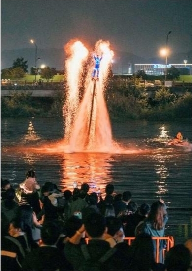 夜幕缓缓降临,表演正式开始。身着荧光电子服的表演者脚踩水上飞行器,手持特制火壶,循着音乐节奏不断跃动、旋转。火壶时而喷薄出金红色火雨,时而划出优美火弧,将现代科技的灵动与火焰的热烈完美融合。舞台后方,贯穿城市的中轴线建筑群在光影映照下,勾勒出清晰的城市轮廓。