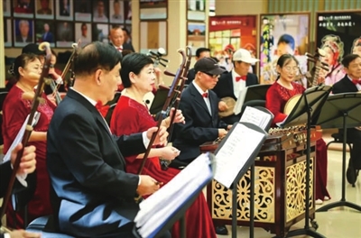 活动伊始,老年大学民乐团一曲《飞驰天路》激昂奏响,老人们专注的演奏瞬间俘获观众。《抗战红歌联奏》响起时,台下银发观众轻声应和,眼中闪烁着过往岁月与当下激情交融的光芒。