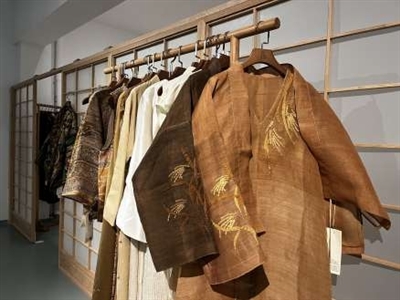 良渚元素服饰是本次展览的亮点,服饰多选用丝、麻等天然面料,以细腻的手工刺绣为点缀,将稻穗、玉鸟、神人兽面纹等纹样呈现在衣料上,款式融入马面裙等国风元素。