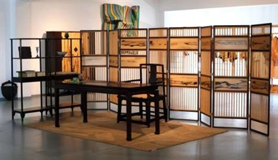 展览中的古典家具也值得细细品味。紫檀木打造的宋韵万历柜,以紫檀瘿木板为门,壸门亮格搭配如意云足,敞亮而内敛。另有十六屉小柜、四出头官帽椅、无束腰三屏风式罗汉床等,均采用黑酸枝、黑柿木系列,天然木纹如泼墨山水画般意境悠远。