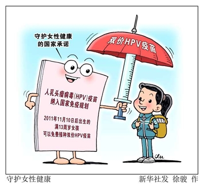11月10日,人乳头瘤病毒(HPV)疫苗正式纳入国家免疫规划。2011年11月10日后出生的满13周岁女孩均可享受免费接种2剂次双价HPV疫苗的政策。