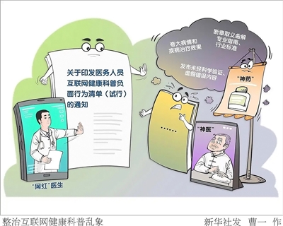 不得发布未经科学验证、虚假错误内容,不得断章取义曲解专业指南、行业标准等,误导公众对科学知识的理解;不得夸大病情和疾病治疗效果,不得以“神医”“神药”名义进行宣传……近日,国家卫生健康委等三部门发布《关于印发医务人员互联网健康科普负面行为清单(试行)的通知》,提出十条负面行为清单,对互联网健康科普乱象精准亮剑。