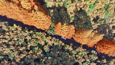 本报讯 (记者 王媛媛 陈玮铭) 在余杭,冬日也可以五彩斑斓。初冬时节,走进东明山森林公园,山路两旁的杉树已然换上火热盛装,层层叠叠的枝叶被染成浓艳的橙红色,像一簇簇炸开的烟花,在清寒的冬日里绽放出别样绚烂,又似一条蜿蜒的“红腰带”,将整座山林的秋冬韵味串联起来。“没想到冬天能有这么艳的景色,杉树红得太好看了,特意带着相机来拍一组写真。”市民王女士举着相机,定格红杉与远山的同框画面。